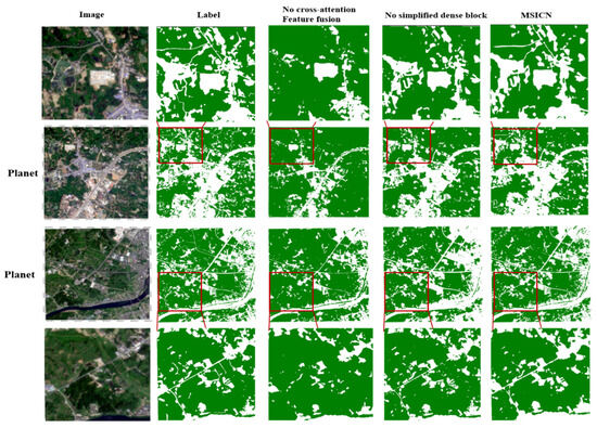 To validate the effectiveness of the dual-path multihead cross-attention feature fusion module, we conducted the first set of ablation experiments by removing the feature fusion module. In the GF2 image region, the F1, IOU, OA, and Kappa coefficients decreased by 4%, 8%, 5%, and 1%, respectively. In the GF7 image region, these metrics decreased by 12%, 17%, 10%, and 24%, and in the planet image region, they decreased by 6%, 12%, 9%, 22%, performing even worse than other models. Details in the magnified red rectangles in Figure 11, Figure 12 and Figure 13 show that in different data sources, recognition results without multihead cross-attention feature fusion exhibited more FPs and incomplete boundaries compared to MSICN, especially in the GF7 and planet image regions. For example, in the GF2 image region, in complex urban areas, vegetation under large building shadows could not be accurately extracted after removing the multihead cross-attention feature fusion. In the GF7 and planet image regions, the results of removing the dual-path multihead cross-attention feature fusion included many misclassifications of farmland as vegetation. This indicates that the dual-path multihead cross-attention feature fusion module is an indispensable part of MSICN, playing a crucial role in maintaining the internal consistency of recognition results and accurate extraction across different data sources.