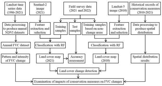 Landsat time series images from 1986 to 2021, Sentinel-2 multispectral data in 2021, field survey samples of different land cover types, historical records of implementing conservation measures, and ancillary data were collected and preprocessed.