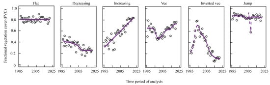 The ‘shape selection forest’ method [55] for fitting nonparametric shape-restricted regression splines to Landsat time series images was used to examine vegetation cover change in this research. For each pixel of a selected spectral band or a vegetation index in Landsat time series, this method can produce a smooth temporal trajectory, representing one of seven possible ‘shapes’ or ‘trend patterns’—flat, decreasing, sudden jump, double jump, vee, inverted vee, and increasing, which reflect the responses of forestland pixels to different disturbances occurring in forested ecosystems. The detailed meanings of these shapes can be found in Moisen et al. [55]. In this study, the FVC time series from 1986 to 2021 were used as the input to ShapeSelectForest package in R software, and the fitting and shape matching methods based on goodness of fit and a penalty were applied to determine the optimal shape to derive the patterns of vegetation changes over time in Changting. According to local FVC characteristics, sudden jump and double jump were combined as jump shape; thus, six shapes were identified, and their change patterns are illustrated in Figure 4.