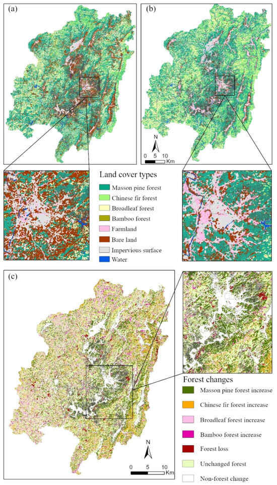 Land cover distribution and change detection results ((a)—land cover classification based on Landsat TM image in 2010; (b)—land cover classification based on Sentinel-2 image in 2021; (c)—forest changes from 2010 to 2021; here, ‘increase’ means the conversions from other land cover types to this type, and ‘loss’ means the conversion from forest to other land cover types).