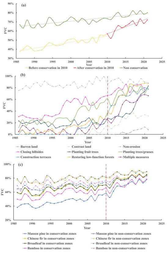 The yearly average FVC change for various forest types at typical sites selected from the land cover map of 2021 in both the conservation zones and the non-conservation zones from 1986 to 2021 (Figure 6c) clearly shows that, among the forest types, broadleaf and Chinese fir forest have similar FVC values, which are higher than Masson pine and bamboo forests in both the conservation zones and non-conservation zones. This can be attributed to the fertile soil conditions in which broadleaf and Chinese fir forests typically grow and the characteristics of the tree species. The FVC values of all the forest types in the non-conservation zones were higher than those in the conservation zones. Even in the early stages of conservation efforts, the differences in FVC values were significant, ranging from 20% to 30%. However, after 2010, the differences in FVC values between the same forest types gradually reduced to 5–8% in 2021. The FVC of all forest types in the non-conservation zones fluctuated, with slight growing trends over the entire study period. In contrast, the FVC values in the conservation zones fluctuated but were unchanged or slowly increased before 2010 and dramatically increased after 2010 when conservation measures were implemented. Although FVC increased rapidly for all the forest types in the conservation zones, the rates of increase varied significantly among different forest types. The FVC in 2021 increased by 33.9% for Masson pine, 22.2% for Chinese fir, 21.3% for broadleaf, and 20.0% for bamboo compared to 2010. In contrast, the corresponding increases in FVC for the same forest types in the non-conservation zones were 13.8%, 11.4%, 9.9%, and 8.9%, respectively. At the end of the study period, the FVC differences between different forest types became narrower. For example, the FVC values of Masson pine and bamboo forests were similar but still lower than those of broadleaf and Chinese fir forests in the conservation zones. However, the FVC values of broadleaf and Chinese fir forests reached as high as those of Masson pine and bamboo forests in the non-conservation zones. The considerable FVC differences between the conservation and non-conservation zones prior to the governance and the reduced gap after imply the important role of implementing conservation measures for improving FVC, thus reducing soil erosion problems.