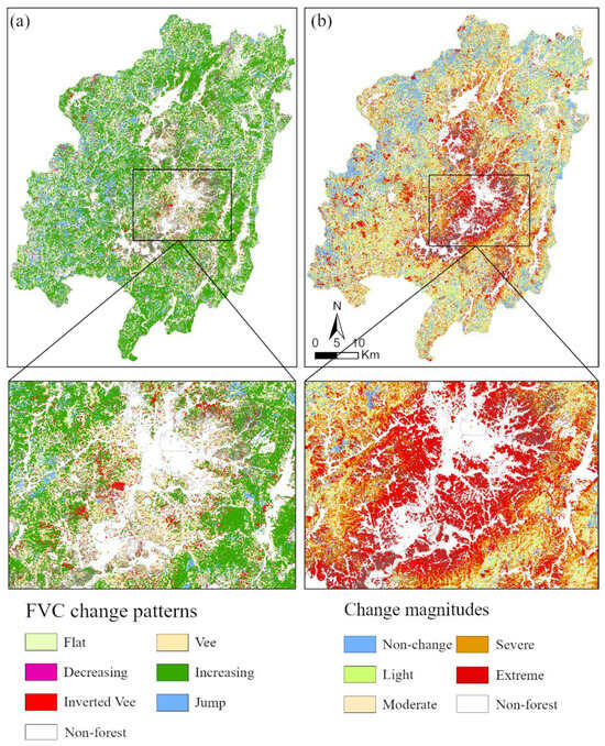 The change patterns and change magnitudes in fractional vegetation cover (FVC) from 1986 to 2021 in Changting County, Fujian Province ((a)—change patterns; (b)—change magnitudes).