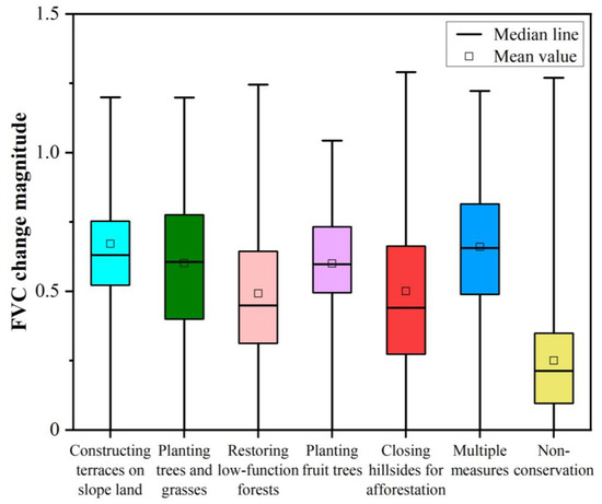 Analysis of the boxplot of the FVC change magnitude with different conservation measures (Figure 8) revealed that both the mean and median FVC change magnitudes in the conservation zones were much higher than those in the non-conservation zones. This suggests a clear effect of conservation on vegetation restoration. When comparing the various conservation measures, it was found that ‘restoring low-function forest’ and ‘closing hillsides’ had similar FVC change magnitudes, with mean values of about 0.50. This was lower than the FVC change magnitudes of ‘planting trees and grass’ and ‘planting fruit tress’ at 0.6 and ‘constructing terraces’ and ‘multiple measures’ at 0.67. Among the conservation measures, ‘multiple measures’ specifically targeting recurrent and severe soil erosion areas resulted in the highest FVC change magnitude. This indicates that the input of labor and resources in these areas achieved the greatest success in vegetation restoration.