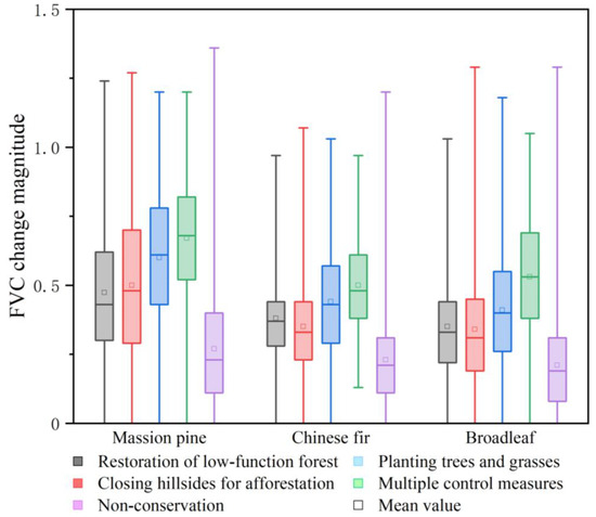 The change magnitudes of fractional vegetation cover (FVC) of major forest types under different conservation measures.