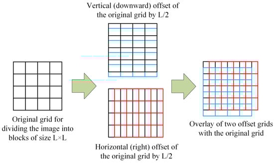 To illustrate this process intuitively, assuming that the input image is divided into a series of image blocks of size L × L using a predefined regular grid, Figure 2 shows the result of moving the original grid to the right and down by L/2. The size of the generated image block is reduced to 1/4 of the original size. Each newly generated block is covered by three original image blocks, which provide additional contextual information for that block. The final category of the block can be obtained by integrating the contextual labels of the original blocks that cover it. In this way, compared with directly dividing into smaller blocks for classification, the accuracy and computational efficiency of built-up area mapping can be greatly improved, and the jagged boundaries can be substantially refined.