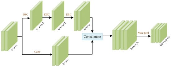 Each FE module (Figure 3) contains two branches composed of different convolutional layers to obtain features of different scales and types. The final output feature maps of the two branches are concatenated and then enter a 2 × 2 max-pooling layer. The lower branch only contains a 1 × 1 convolutional layer that is used to undertake the low-level features of the previous convolutional module/layer. The upper branch consists of three (including one 1 × 1 and two 3 × 3) DSC [] layers that have fewer parameters but a higher computational efficiency than the standard convolution. Here, the 1 × 1 DSC layer is used to compress the number of channels of the feature and reduce the amount of calculation for subsequent operations. The first 3 × 3 DSC layer is used to obtain the initial semantic information, whereas the second 3 × 3 DSC layer is used to enhance and obtain higher-level semantic features. In addition, all convolutional and DSC layers are followed by batch normalization and a rectified linear unit.
