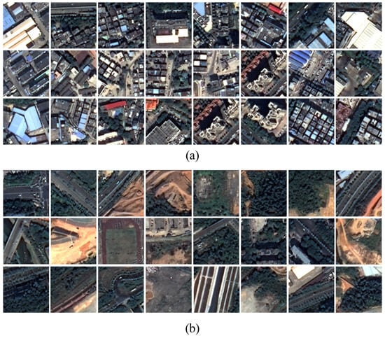 To verify the effectiveness of the proposed method, an evaluation dataset was constructed using Gaofen-2 satellite images covering the study area. The Gaofen-2 satellite was successfully launched on 19 August 2014. It is China’s first civilian optical remote sensing satellite with a spatial resolution better than 1 m (nadir: 0.8 m), equipped with two HR 1 m panchromatic and 4 m multispectral cameras. The used images include three channels of RGB with panchromatic sharpening and a spatial resolution of 1 m. The training set consists of 9808 sample images, with 4904 samples in the built-up and non-built-up areas, and each sample image has a size of 112 × 112. Figure 6 shows some sample images from these two classes, each containing scenes that are as diverse as possible. The test set includes satellite images of five sub-regions in Shenzhen, as shown in Figure 5, with sizes of 8960 × 7840 (Test 1), 10,080 × 8960 (Test 2), 8400 × 8400 (Test 3), 8960 × 8960 (Test 4), and 8400 × 8400 (Test 5). The basic processing of these data in the study area was completed through PIE and ArcGIS.
