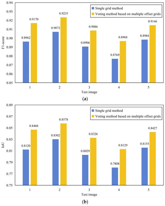 F1-scores (a) and IoU (b) values using different grid partitioning methods.