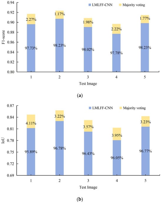 Percentage stacked bar charts for F1 score (a) and IoU (b), showing how much LMLFF-CNN and majority voting contribute to accuracy.