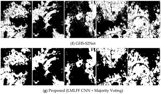 The proposed method can achieve superior performance in the extraction of built-up areas, primarily due to two key techniques: the LMLFF-CNN model and majority voting. To further understand their performances in the extraction of built-up areas, Figure 8 shows a percentage stacked bar chart in terms of F1 score and IoU, showing how much they contribute to accuracy. In the proposed method, the LMLFF-CNN model plays a crucial role, whereas majority voting contributes less than 5% to accuracy. Nevertheless, majority voting remains important in the proposed methods.