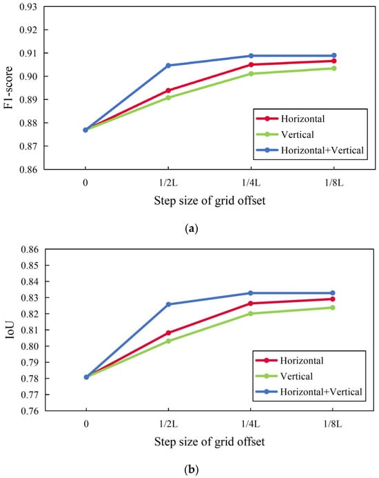 F1-scores (a) and IoU values (b) of built-up area detection using offset grids with different directions and step sizes. The directions of grid offset include horizontal, vertical, and their integration. The offset steps include 0, 1/2 L, 1/4 L, and 1/8 L, where L = 112 is the length of the original grid.