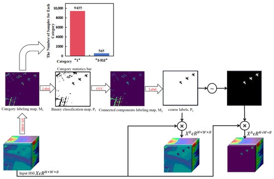 - Extracting Prior Knowledge with Dual Clustering: The purpose of dual clustering is to obtain coarse labels for supervised network learning and provide the network with a clear learning direction to enhance its performance. Dual clustering (i.e., unsupervised DBSCAN and connected domain analysis clustering) techniques can be employed to cluster the HSI from the spectral domain to the spatial domain, which yields preliminary separation results between the background and anomaly regions. Subsequently, prior samples representing the background and anomaly regions are obtained through this processing, which effectively purifies the supervision information provided to the deep network by conveying more background-related information as well as anomaly related information. These anomaly features are then utilized to suppress anomaly generation while the background features contribute toward reconstructing most of the background.