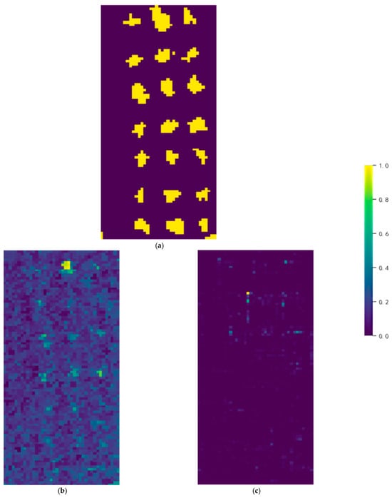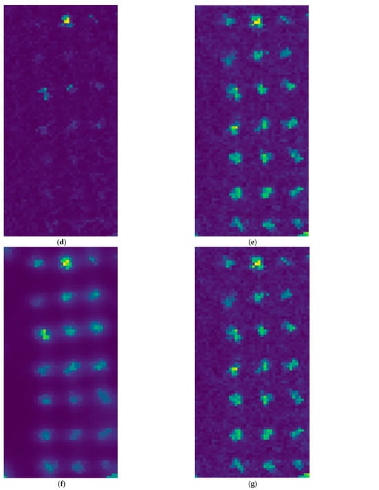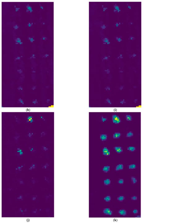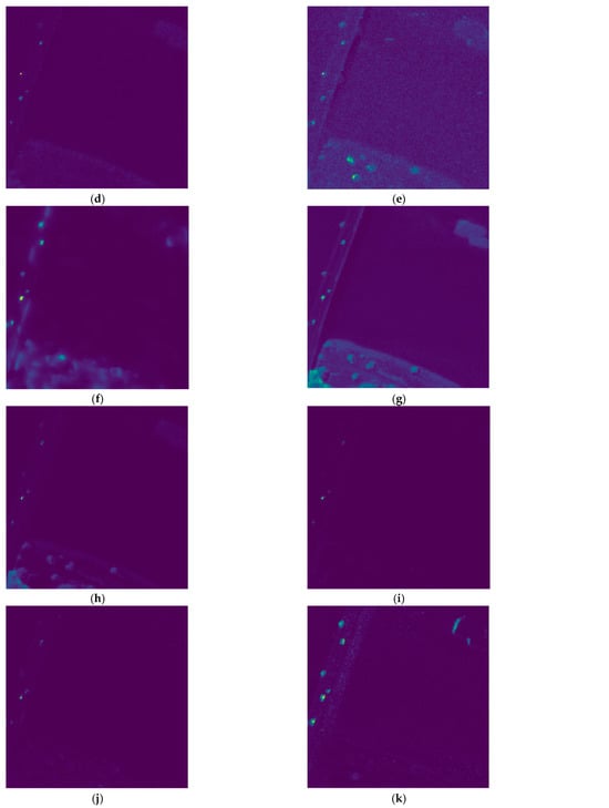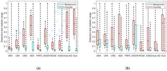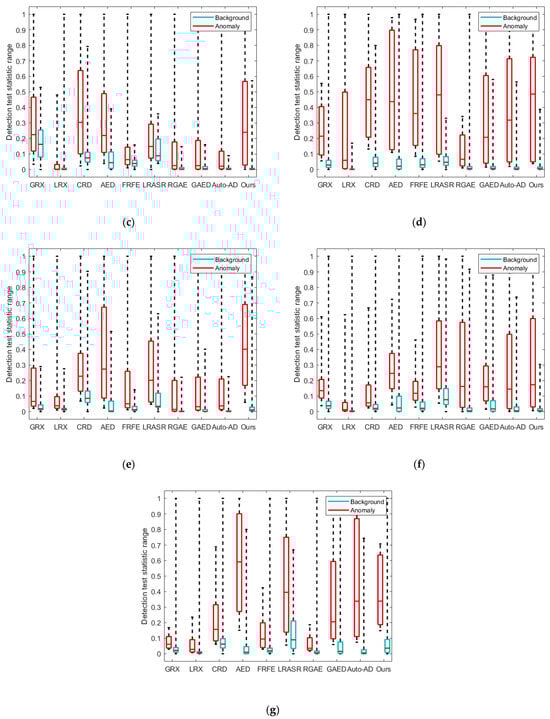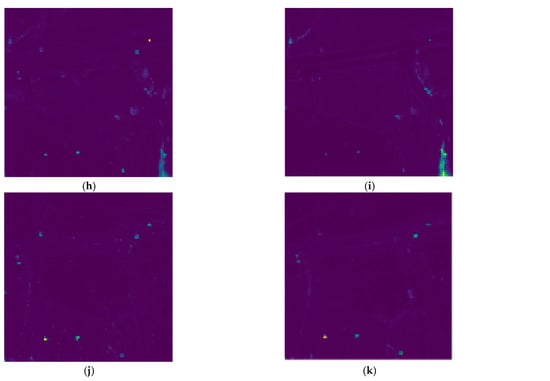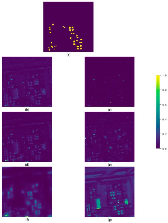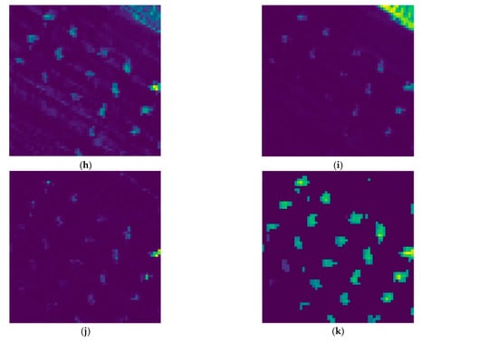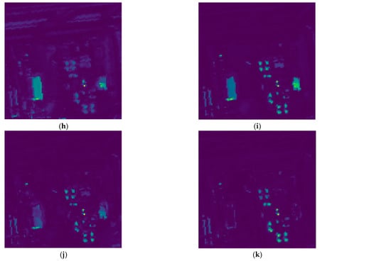 - Los Angeles-1 (LA-1) Dataset: This dataset was acquired by the AVIRIS sensor over the Los Angeles area. The spatial resolution is 7.5 m and the image size is 100 × 100. It encompasses a total of 205 spectral bands within the range of 430–860 nm. Figure 5g displays the pseudocolor image and the ground-truth map of this dataset. Notably, there are a few houses that are considered anomaly targets in these images, which comprise a total of 232 pixels, accounting for 2.32% of the entire image.