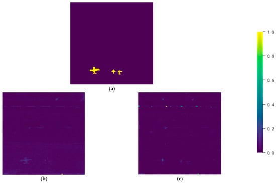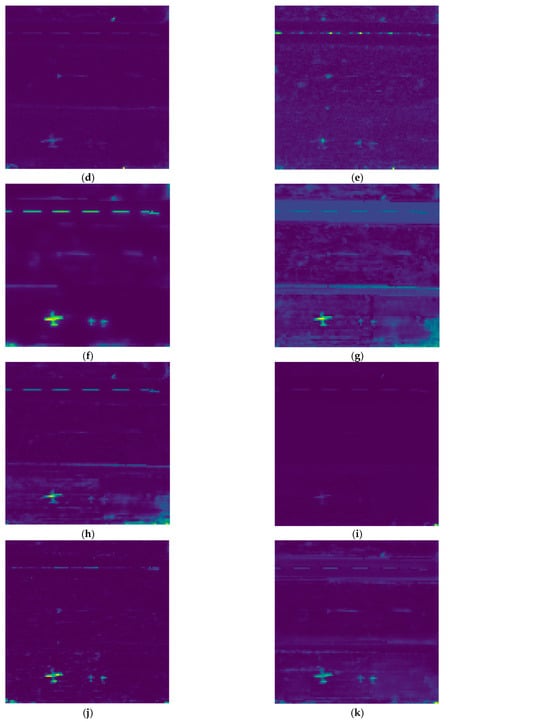 - Gulfport Dataset: This dataset was acquired by the AVIRIS sensor over Gulfport, Southern, MS, USA, in 2010. The spatial resolution is 3.4 m and the image size is 100 × 100. After eliminating bands with a low signal-to-noise ratio (SNR), a total of 191 bands remained. The spectral coverage spans from 400 to 2500 nm. Figure 5h displays the pseudocolor image and the ground-truth map of this dataset. Three airplanes of various sizes are identified as anomaly targets comprising a total of 60 pixels and accounting for 0.60% of the entire image.