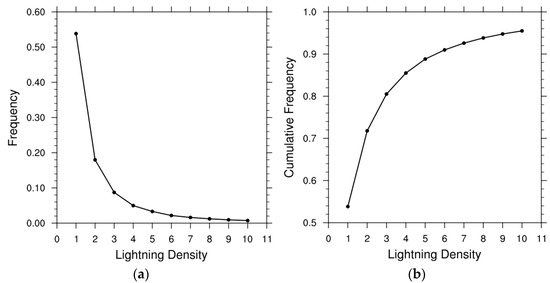 (a) Frequency of the lightning density. (b) Same as (a) but for the cumulative frequency. The horizontal coordinate is the lightning density, and the vertical coordinate is the frequency (cumulative frequency).