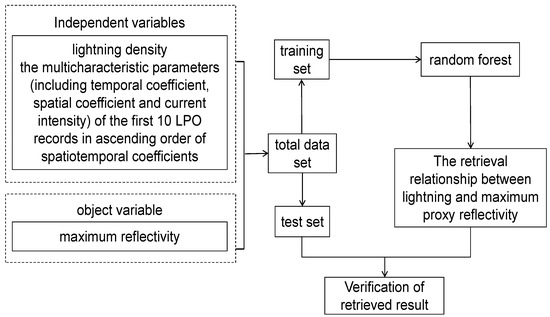 The process of constructing the relationship between lightning and maximum proxy reflectivity is shown in Figure 3. The total data set is constructed using the maximum reflectivity, lightning density, and multi-characteristic parameters of the 10 LPO records. The lightning density and multi-characteristic parameters are used as independent variables, and the maximum reflectivity is used as the object variable. The multi-characteristic parameters include temporal coefficient, spatial coefficient, and current intensity. The 10 LPO records are ranked in ascending order of spatiotemporal coefficient. A portion of the total data set is randomly selected as the test set, and the rest is selected as the training set. The training set and the random forest are used to train the retrieval relationship between lightning and maximum proxy reflectivity, and the test set is used to compare the effect of the new retrieval relationship with that of the empirical GSI relationships. The details are described below.