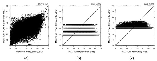 (a) Scatter plot of the observed maximum reflectivity compared with the FRST retrieved results. (b) Same as (a) but for the GSI1 retrieved results. (c) Same as (a) but for the GSI2 retrieved results. The horizontal coordinate is the observed maximum reflectivity (unit: dBZ), and the vertical coordinate is the maximum proxy reflectivity (unit: dBZ).