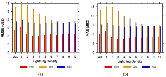 The root mean square error and mean absolute error of the FRST are smaller than those for the GSI1 and GSI2; notably, the root mean square error of FRST (8.13 dBZ) is 50.85% and 28.05% lower, respectively (Figure 7a). Additionally, the mean absolute error of the FRST (5.93 dBZ) is 57.15% and 35.19% lower than that of GSI1 (13.84 dBZ) and GSI2 (9.15 dBZ), respectively (Figure 7b). Both the root mean square error and mean absolute error of the FRST are also smaller than those of the empirical GSI relationships at each fixed lightning density (Figure 7a,b). Thus, considering more lightning characteristics, i.e., more complicated relationships, and learning the retrieval relationship with a machine learning method instead of the traditional fitting method could be the reason for the reduced root mean square error and mean absolute error in FRST.