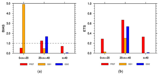 In previous studies, the regions with maximum reflectivity of 20–40 dBZ and >40 dBZ are defined as stratiform and convective cloud regions, respectively [51,52,53,54]. In this paper, maximum reflectivity is divided into three intervals, namely, (0, 20] dBZ, (20, 40] dBZ, and >40 dBZ, and BIAS and ETS are calculated in different intervals. Overall, the FRST is the best of the three relationships (Figure 8).