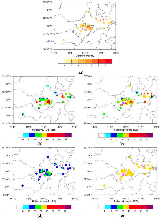 (a) Lightning density within the time window from 1330 UTC to 1410 UTC on 7 June 2022. (b) Observed maximum reflectivity (unit: dBZ) at 1400 UTC on 7 June 2022. (c) Same as (b) but for the FRST retrieved results. (d) Same as (b) but for the GSI1 retrieved results. (e) Same as (b) but for the GSI2 retrieved results. The gray lines indicate the city/provincial borders. ‘CZ’ and ‘HS’ represent Cangzhou City and Hengshui City, respectively.