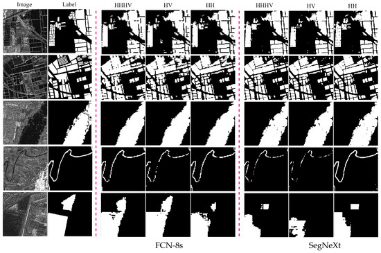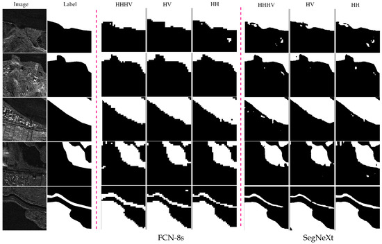 Table 5 indicate that all four models achieve F1 scores of over 85%, with U-Net exhibiting the best performance. In the dual-polarization mode, U-Net achieves F1, PA, and mIoU scores of 92.110%, 98.371%, and 85.374%, respectively. DeeplabV3+ closely followed, achieving F1, PA, and mIoU scores of 91.199%, 98.188%, and 83.822% in the dual-polarization mode. In comparison, FCN-8s and SegNeXt networks demonstrate relatively poorer performance in water area segmentation, with F1 scores of 90.361% and 90.192% in the dual-polarization mode.