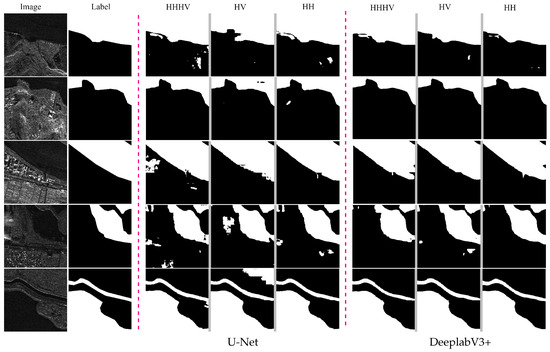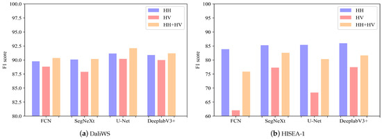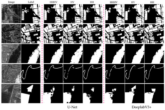 Figure 8, it can be seen that U-Net achieves the best segmentation performance across all three modes. The models trained with HV single-polarization data performed the worst. In the fourth row of