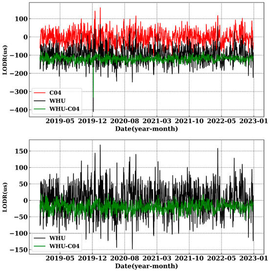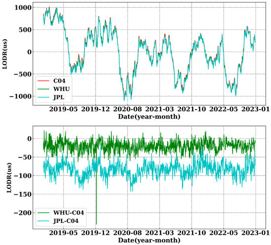 The LODR data for WHU and JPL from January 2019 to December 2022 were compared with the LODR data from IERS C04, as shown in Figure 3.