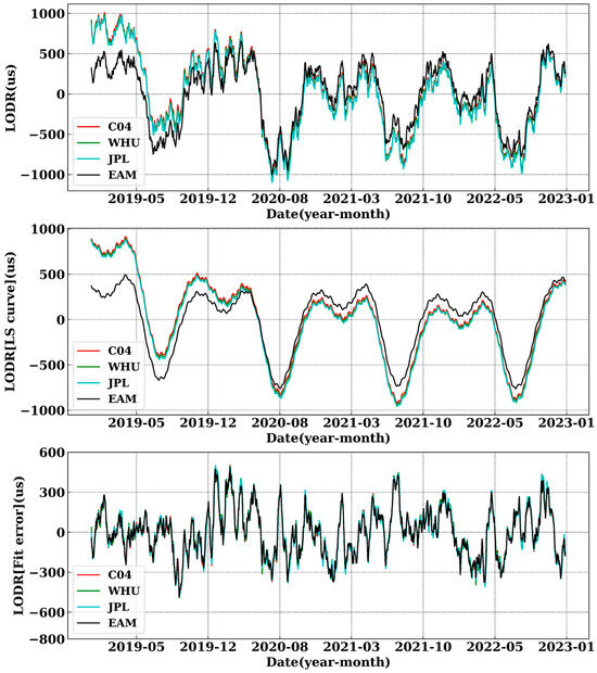 In the top panel, the red, green, light blue, and black lines represent the LODR sequences for C04, WHU, JPL, and EAM, respectively. In the middle panel, the red, green, light blue, and black lines represent the least squares fitting of LODR for C04, WHU, JPL, and EAM, respectively. In the bottom panel, the red, green, light blue, and black lines represent the residual terms of the least squares fits for C04, WHU, JPL, and EAM LODR data, respectively.