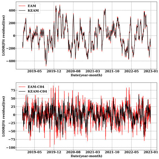 As can be seen in Figure 6, after filtering, the difference between the residuals of EAM LODR (least squares fitting residuals) and C04 LODR (least squares fitting residuals) is smaller. In other words, the black line in the lower figure is more stable with smaller fluctuations compared to the red line.