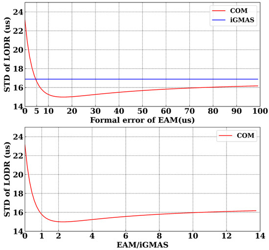 Similar findings to Figure 7 were observed in Figure 9, showing a gradual convergence of the combined LODR towards the precision of iGMAS LODR as the formal error of EAM increased. When the ratio of formal accuracy between EAM and iGMAS is 2–4 times, i.e., the formal accuracy of EAM is between 10 and 30 us, it can result in a higher combined LODR precision (iGMAS formal accuracy at 7.20 us).