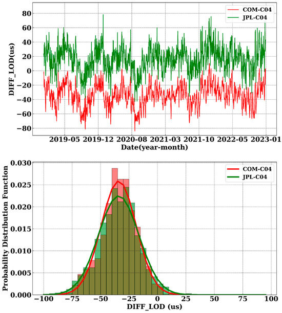 The red, green, and light blue lines in the top panel represent the LODR data from C04, WHU, and JPL, respectively. In the bottom panel, the green and light blue lines represent the difference between WHU and C04 LODR, and JPL and C04 LODR, respectively. To facilitate distinction, a bias of −50 us was added to the JPL and C04 LODR difference.
