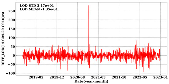 From Figure 13, it can be observed that there seems to be a slight deviation between IERS 14 C04 and IERS 20 C04. The standard deviation of the difference in LOD values is 21.7 us. We noticed that LOD values in IERS 20 C04 and IERS 14 C04 exhibited a mismatch on 20 December 2020. The difference in LOD values was around 300 us. We suspect that this difference on 20 December 2020 may be abnormal.