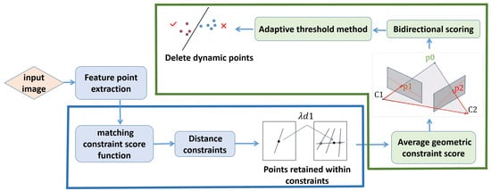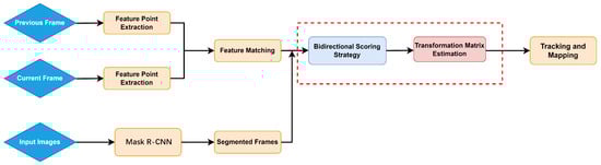 The overall framework of the proposed dynamic SLAM system. The dynamic feature point filtering module (marked in a red rectangular box) consists of two components: bidirectional scoring strategy and transformation matrix estimation. In forthcoming work, detailed explanations for the specific processes of these two algorithms will be presented (Figure 2 illustrates the bidirectional scoring strategy, and Figure 5 demonstrates the process of transformation matrix estimation).