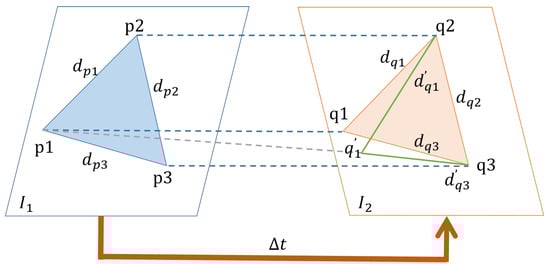 Figure 2 shows a conceptual diagram of bidirectional scoring strategy for the filtering of dynamic feature points. The part inside the blue rectangular box is the accuracy constraint for matching points. In the stage of image feature point matching, we identified matching point pairs when the maximum Hamming distance was significantly larger than the second-closest Hamming distance; then, they were classified as reliable matches. The portion inside the green rectangular box represents our bidirectional scoring strategy. After passing through the accuracy constraint for image feature points, the feature point pairs had a relatively accurate matching relationship, but dynamic feature points were also retained. To further filter out the dynamic feature points in a scene, this study introduced a geometric constraint model of the image feature points, as shown in Figure 3. The query image and the target image are two adjacent frames, and the sampling time interval between them is very short; therefore, the camera projection distortion caused by the camera’s pose transformation is very small. The triangle vertices in the figure represent the extracted ORB feature points, with three pairs forming two triangles and on and ; the vertices , , and are the three feature points on , and they match the three feature points , , and on , respectively. Furthermore, each side, d, of the triangle is the Euclidean distance [] between the feature points.