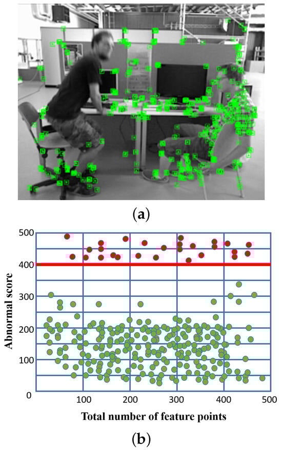 Schematic representation of dynamic feature filtering. (a) Feature point extraction from a dynamic scene. (b) Distribution of anomalous scores of feature points, the green points represent normal feature points, while the red points denote abnormal feature points.