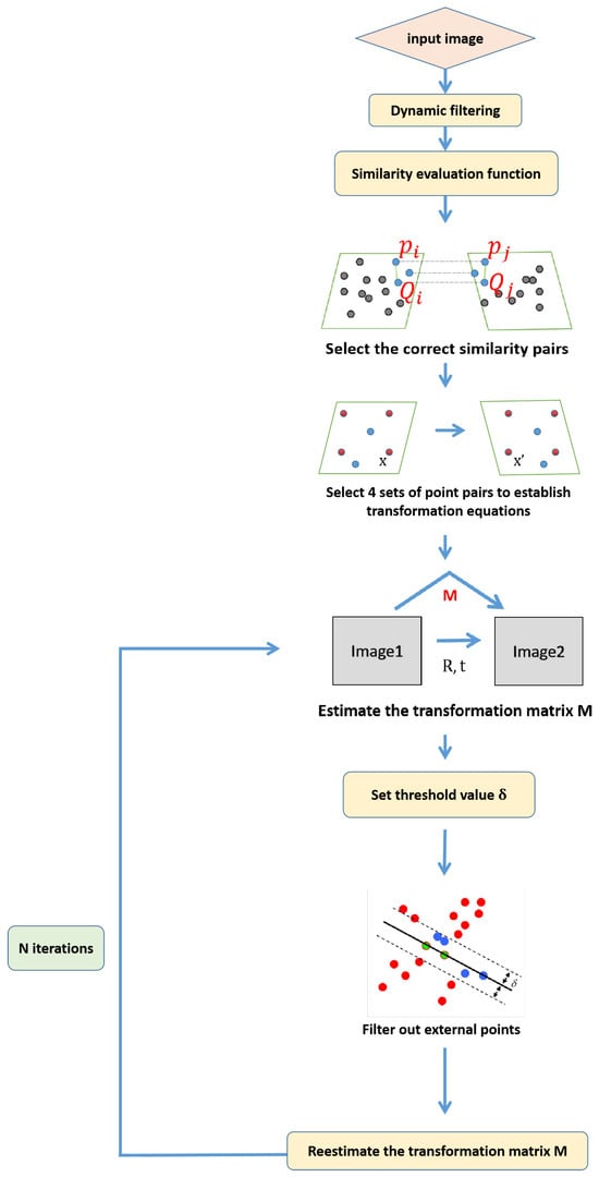 The pose transformation relationship between image frames can be represented by a fundamental matrix. In this study, we propose an algorithm that incorporates intrinsic constraints between samples to guide selective sampling with the aim of obtaining an improved fundamental matrix. Firstly, dynamic feature points in a scene were filtered out through coarse filtering. Then, the function for the evaluation of the similarity of key points in two images was improved, and it was optimized to achieve accurate matching of the key point pairs. Figure 5 illustrates a conceptual diagram of the transformation matrix estimation.