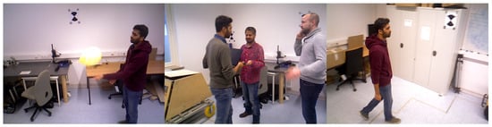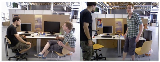 The TUM RGB-D dataset is a widely used computer vision dataset that is mainly used for visual SLAM research, and it includes a series of RGB and depth images of indoor scenes, as well as corresponding camera motion trajectories. We used the Dynamic Objects category in the TUM RGB-D dataset, which contains dynamic objects recorded with an Asus Xtion sensor. The dataset that we tested had a total of eight sequences: the sitting_static, sitting_xyz, sitting_halfsphere, sitting_rpy, walking_static, walking_xyz, walking_halfsphere, and walking_rpy image sequences. These sequences were of two types, as shown in Figure 6: sitting sequences and walking sequences. In the sitting sequences, two people sat at a table, chatted, spoke, and made some gestures. In the walking sequences, two people stood up, walked through an office, and finally sat back down in their original positions. Each type also included four types of sensor movements: static—the sensor was manually fixed; xyz—the sensor moved in three directions (xyz); rpy—the sensor rotated along the main axis; halfsphere—the sensor moved on a hemisphere with a diameter of approximately 1 m.