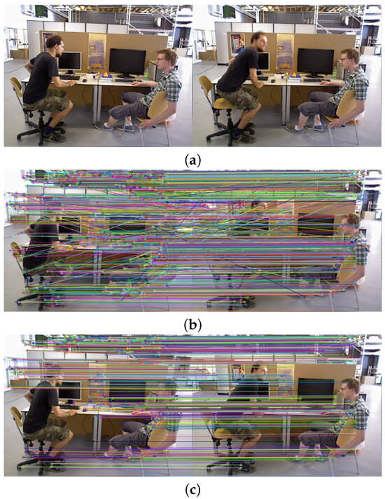 Feature matching results based on the distance accuracy constraint. (a) Original image for feature matching. (b) ORB feature matching. (c) Filtering out feature mismatches.