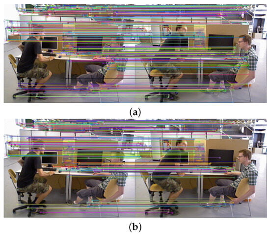 Feature matching results based on the bidirectional scoring strategy. (a) Filtering out feature mismatches. (b) Dynamic feature filtering.