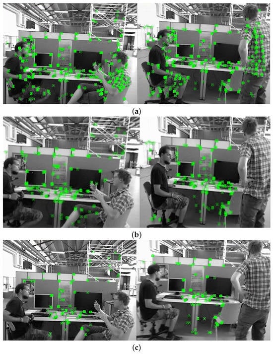 In Figure 10c, it can be clearly seen that the majority of the feature points on the legs of the person in the left image and the feature points on the chairs in the right image were filtered out, with only a few feature points remaining in the contour of the dynamic target. This indicated that the transformation matrix estimation was able to effectively compensate for the shortcomings of semantic segmentation with Mask R-CNN, thereby improving the suppression of dynamic feature points.