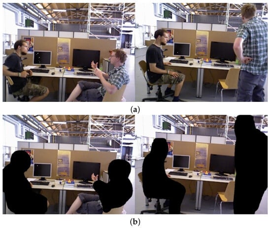 DynaSLAM’s utilization of Mask R-CNN for the semantic segmentation of dynamic objects in sequence images. The images on the left came from the sitting sequence, while the images on the right came from the walking sequence. (a) Original images of dynamic scenes. (b) Semantic segmentation of images using Mask R-CNN.