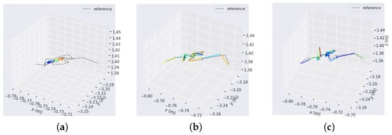 Figure 10a shows the feature point extraction effect of ORB-SLAM3 in dynamic scenes, Figure 10b shows the feature point filtering effect of DynaSLAM in dynamic regions, and Figure 10c shows the feature point filtering results of the transformation matrix estimation in dynamic regions; green dots represent the positions of ORB feature points. In Figure 10a, it can be seen that ORB-SLAM3 did not perform any processing on dynamic objects, and the feature points of the dynamic area were preserved.