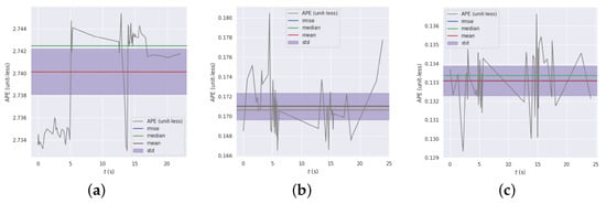 The APE over time for ORB-SLAM3, DynaSLAM, and the proposed system on the highly dynamic sequence fr3_w_static. (a) ORB-SLAM3, due to a significantly large rmse, the blue lines representing the error exceed the boundaries of the error comparison chart. (b) DynaSLAM. (c) Proposed system.