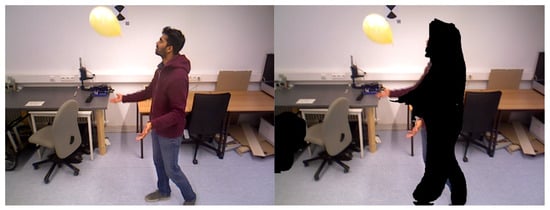 As shown in Table 4, the experimental results for the three sequences in the dataset demonstrated significant improvements in accuracy for the four RPE metrics. Based on the experiments with the b_balloon sequence, our proposed method achieved an accuracy improvement that was comparable to that of DynaSLAM and ORB-SLAM3. This similarity in the accuracy improvement was attributed to DynaSLAM’s neural network segmentation model, which lacked prior information about balloons, leading to the inaccurate segmentation of balloons in the scene, as illustrated in Figure 14. The fast-moving balloons in the image frames significantly impacted DynaSLAM’s feature matching and pose estimation, resulting in only a marginal improvement in trajectory accuracy over ORB-SLAM3. Our method effectively addressed the interference caused by the dynamic target of the balloon. In the b_p_tracking sequence, where individuals moved rapidly and the texture on their clothing was not particularly distinct, ORB-SLAM3 tended to extract fewer feature points on people when they moved quickly. As a result, the rapid movement of people had a minimal impact on the pose estimation with ORB-SLAM3. Additionally, due to the fast movements of both people and the camera, DynaSLAM experienced tracking loss at a certain point in the scene, leading to lower mean and median values than those of ORB-SLAM3.