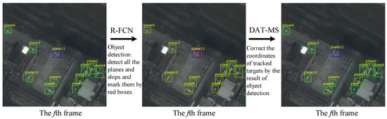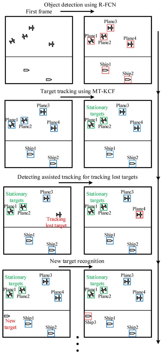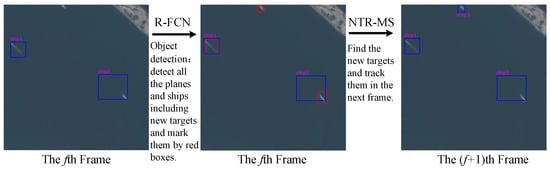 Figure 3 shows the proposed pipeline for multi-target tracking. Figure 4 shows the flowchart of the proposed method. The whole architecture consists of four modules: object detection; multi-target tracking (MT-KCF); detecting-assisted tracking (DAT); and new emerging target recognition (NTR). The four modules in TDNet are processed as follows: (1) The pre-trained R-FCN is used to detect the ships and planes in the first frame of a video so as to obtain the coordinate information and category information of all the targets to be tracked. Then, all the detected targets are numbered in-class as the basis for MT-KCF. (2) MT-KCF is used to accomplish multi-target tracking. (3) DAT is used to assist the tracking process, such as, for example, tracking lost targets. (4) NTR is used to realise the recognition of new targets.