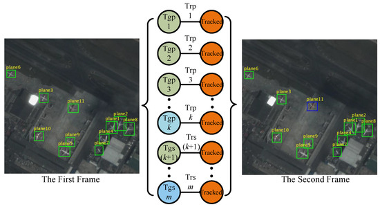In recent years, since the successful launch of the Jilin No. 1 optical remote sensing video satellite, the interpretation of optical remote sensing videos has become a new and important topic in the field of remote sensing. Remote sensing videos capture dynamic changes in ground targets, which provide much more sufficient information than remote sensing images. With this new type of remote sensing data, many potential applications can be conducted, including surveillance of ground facilities, the dynamic monitoring of natural disasters or environments, and especially military security []. Target tracking plays an important role in video analysis and surveillance []. It is of great significance to track and generate moving trajectories of multiple targets in remote sensing videos []. For example, the behaviours and intentions of targets can be analysed and predicted based on their moving trajectories; the targets can be clustered based on the moving relationship between them; and moreover, target tracking can be integrated into satellites via processors with low power and high performance for real-time monitoring of important targets. Therefore, in this paper, we intend to develop a tracking system for remote sensing videos that detects and tracks all specified targets. This has been studied by very few scholars [] due to the absence of data.