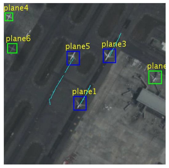 Figure 7 shows an example of multi-target tracking where static targets are surrounded by green boxes and moving targets are marked by blue boxes with azure lines as their trajectories. The boxes of statistic targets should stay as statistics. However, due to the slight variance in the learned filter, there may be certain errors that lead to changed boxes. Therefore, we recognise the statistic targets via the location of their center and fix the changed boxes. The behaviour of the moving targets can be analysed by their trajectories. For example, the trajectory of Plane 5 was found to be longer than others (which meant that Plane 5 was taking off).
