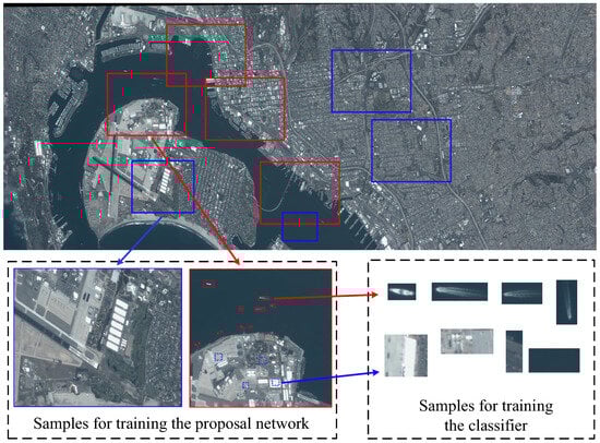 As introduced in Section 3, R-FCN should be first trained on annotated data in order to accurately recognise and locate the corresponding targets. In this paper, we followed the basic training process of R-FCN [], where it was first pre-trained on the ImageNet data set [], which is a large-scale image data set. Then, the layers of D, E, and F, as shown in Figure 1, were fine-tuned with labeled frames that were extracted from a training video captured on a Jilin No. 1 commercial remote sensing satellite. A training frame is exhibited in Figure 11, where many patches were extracted to train the proposal network, which was used to generate the proposal boxes that contain targets. The samples include patches containing targets and no targets. The classifier was trained on image patches with a single object, and these were used to distinguish different targets, as well as the background. As introduced above, a frame was selected in the consecutive 20 frames, which was found to be enough to adequately train R-FCN.
