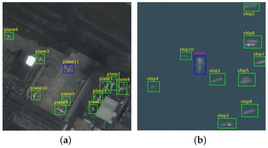 We used the pre-trained R-FCN to detect the ships and planes in the first frame of the video; furthermore, we also obtained the coordinate information and category information of all the objects to be tracked. Then, the coordinate information was converted into the top left coordinate , as well as into the height and width coordinate , where and m represents the number of all detected objects. Next, we performed in-class numbering for all m targets and used the numbered information as the basis for multi-object tracking. Figure 5 shows the object detection results and the in-class numbering results.