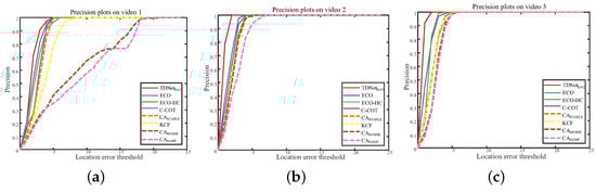 Precision plots of the moving target as captured by TDNetDAT and the other seven compared methods on (a) Video 1, (b) Video 2, and (c) Video 3.
